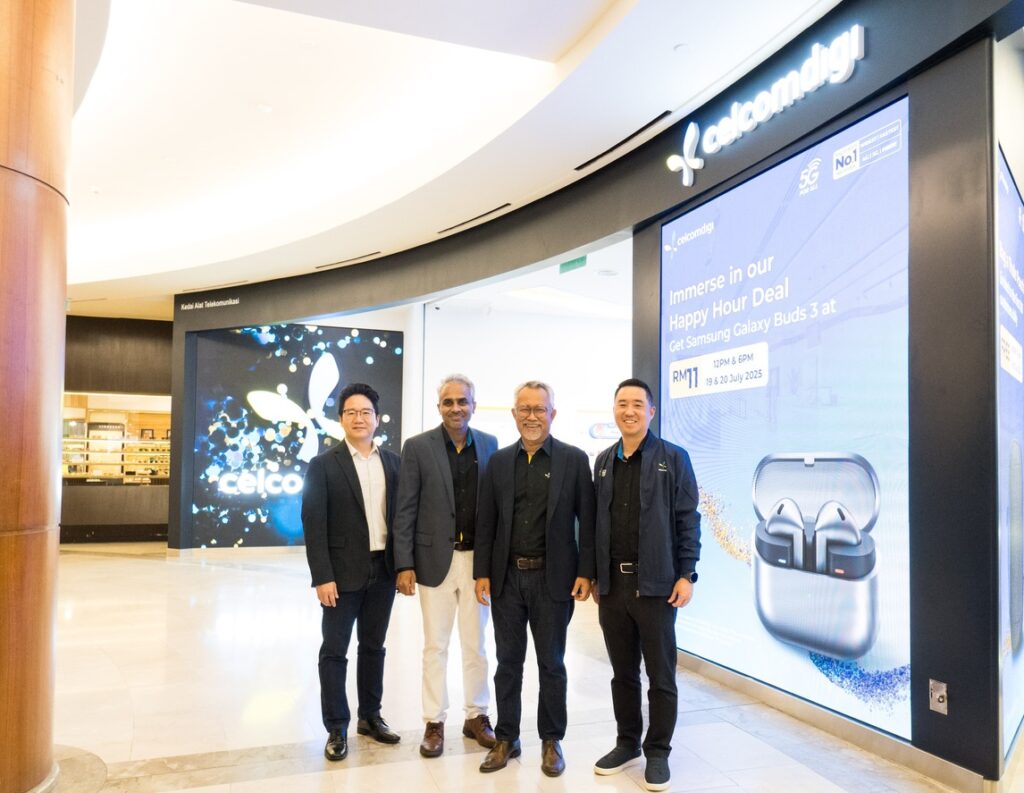 From L-R: Samsung Malaysia president Charles Kim, CelcomDigi’s CEO, Datuk Idham Nawawi, deputy CEO Albern Murty and chief sales & retail officer Cheng Weng Hong at the official launch of CelcomDigi flagship store Life at The Gardens Mall, Kuala Lumpur on July 16, 2025.