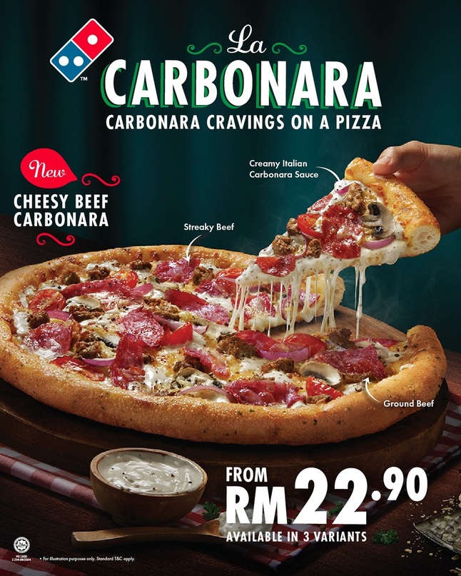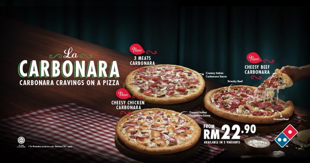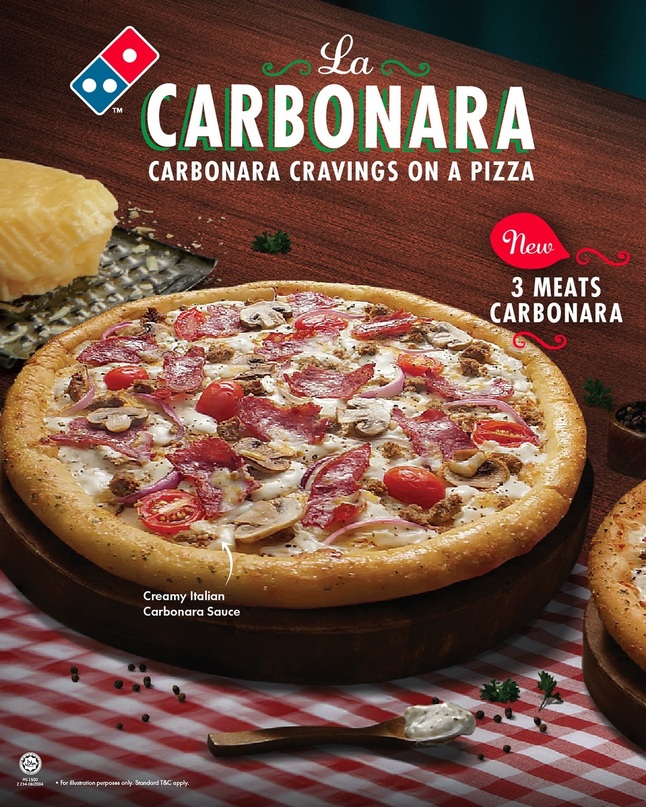 The new La Carbonara pizza offered in three variants to satisfy your creamy and rich carbonara cravings, available now at Domino’s outlets nationwide.