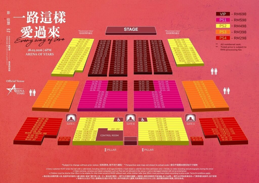 Tickets to the “Every Way of Love” concert are priced at RM698 (VIP), RM598 (PS1), RM498 (PS2), RM398 (PS3) and RM298 (PS4).